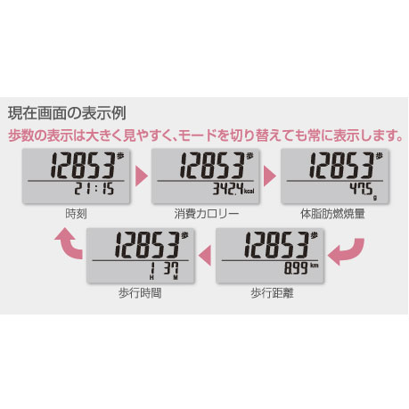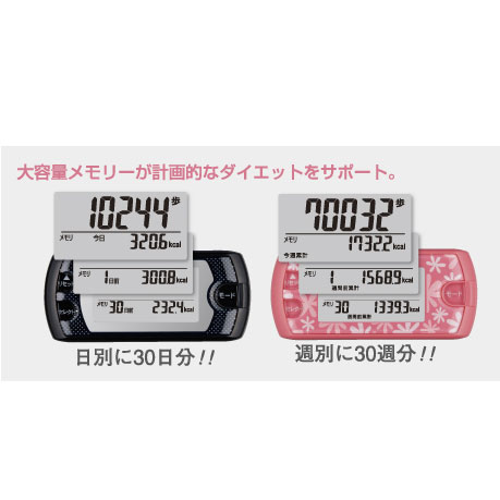 ■3方向加速度センサー採用■体脂肪燃焼量などの多彩なデータを表示■30日・30週間分の大容量メモリー表示項目 歩数:0〜999999 歩行距離:0.00〜9999.99 歩行時間:0〜999時間59 消費エネルギー量:0.0〜99999.9 脂肪燃焼量:0.0〜99999.9 活動エネルギー量:- グラフ表示:- 時刻表示:24時間表示メモリ機能:30日間通信機能:-電源:リチウム電池 CR2032 x 1個寸法:幅 76x高さ 33.5x奥行 10mm質量:約24g付属品: お試し用電池(CR2032 1個) 簡易ドライバー 取扱説明書・保証書体脂肪燃焼量が計れてダイエットサポート